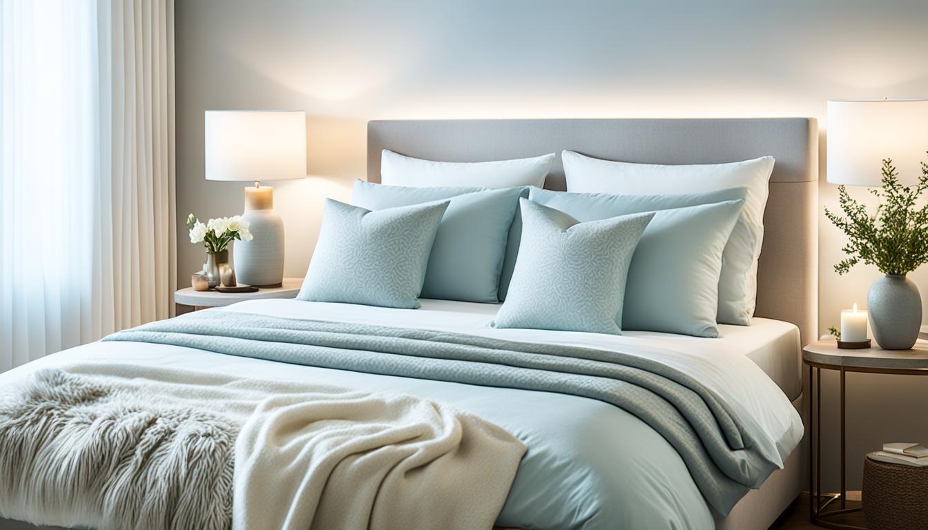 A serene bedroom with soft ambient lighting and a cozy atmosphere.